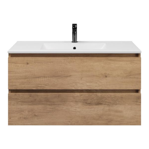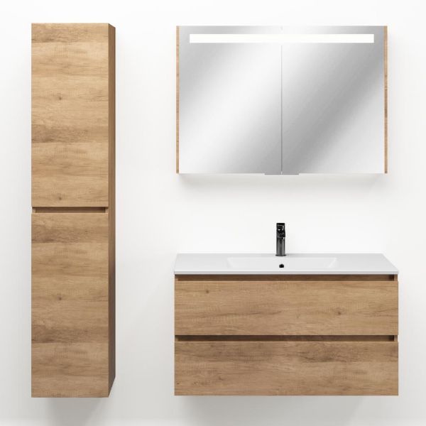 | | TrisLine Gia/Faro badmeubel 100x46 2 softclose laden sevilla eiken greeploos keramische wastafel mat wit met 1 kraangat |