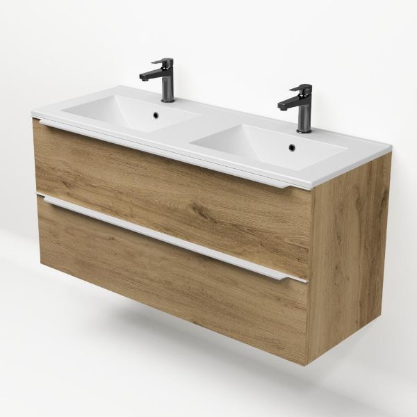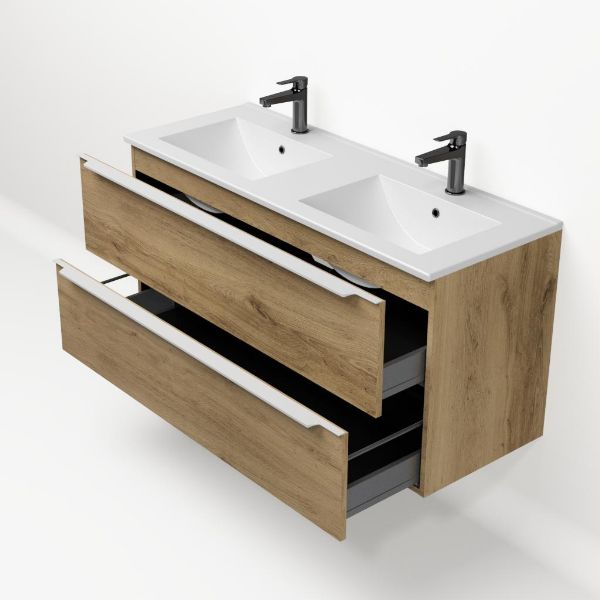 | Bellanti Lucilla/Faro badmeubel 120x46 2 softclose laden warm eiken met greep naar keuze keramisch wastafel dubbel mat wit met 2 kraangaten |