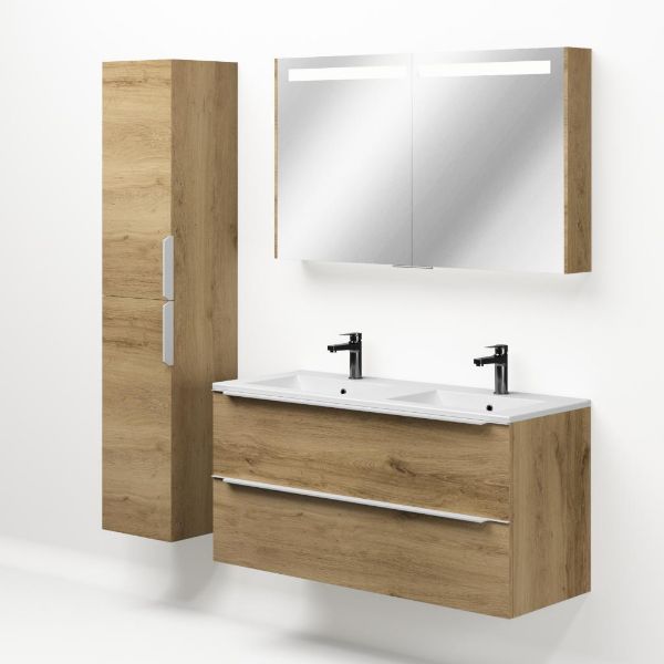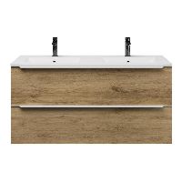 | | Bellanti Lucilla/Faro badmeubel 120x46 2 softclose laden warm eiken met greep naar keuze keramisch wastafel dubbel mat wit met 2 kraangaten |