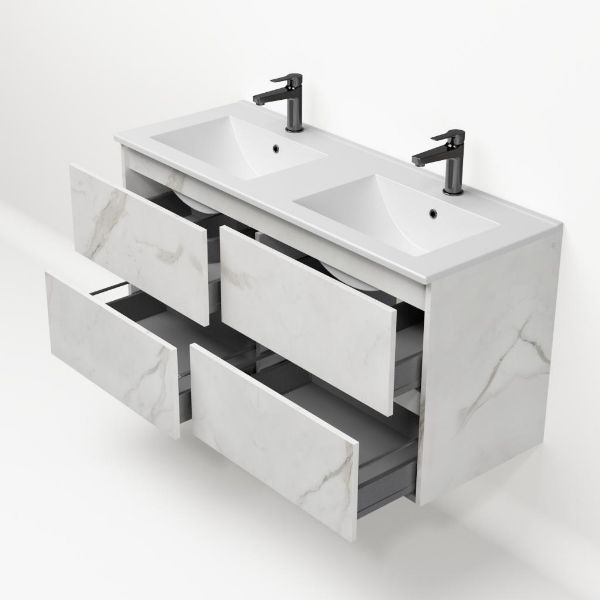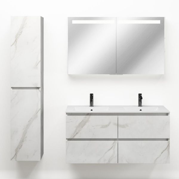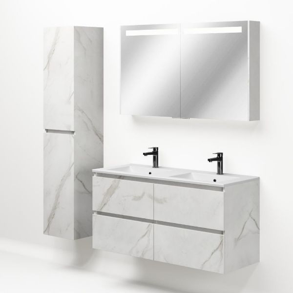 | Bellanti Elena/Faro badmeubel 120x46 4 softclose laden marmer structuur wit greeploos keramische wastafel dubbel mat wit met 2 kraangaten |