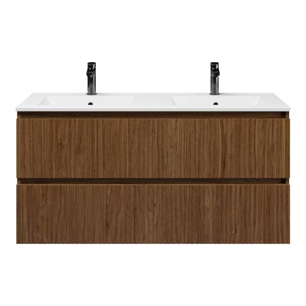 | Bellanti Silvan/Faro badmeubel 120x46 2 softclose laden met ribbel - latjes structuur warm noten greeploos keramisch wastafel dubbel wit met 2 kraangaten |