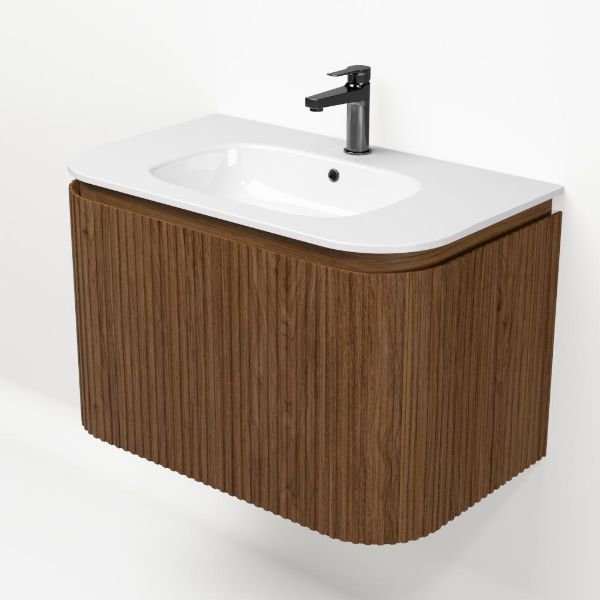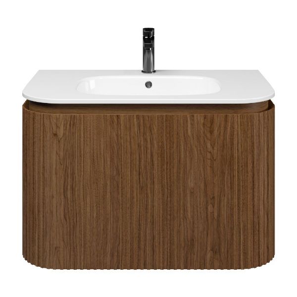 | Bellanti Avelino/Marta badmeubel met ronde hoeken, ribbel - latjes structuur, 80x48 2 softclose laden (1 binnenladen) warm noten greeploos polystone wastafel wit met 1 kraangat |