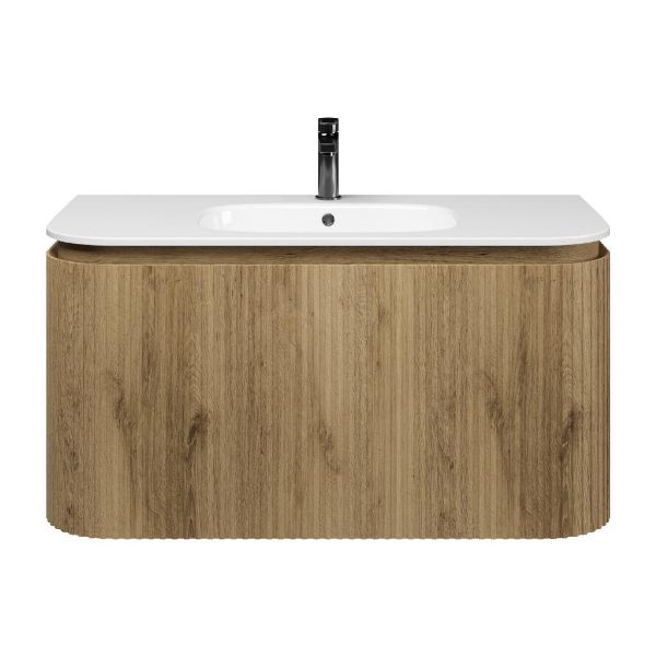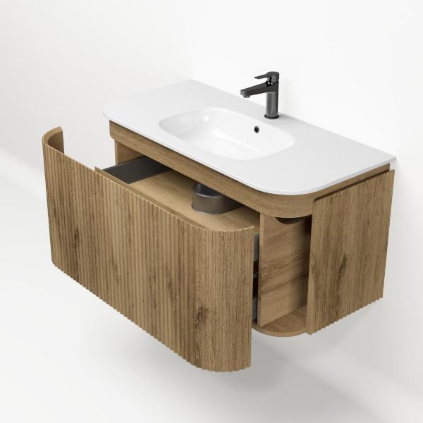| Bellanti Avelino/Marta badmeubel met ronde hoeken, ribbel - latjes structuur, 100x48 2 softclose laden (1 binnenladen) warm eiken greeploos polystone wastafel wit met 1 kraangat |