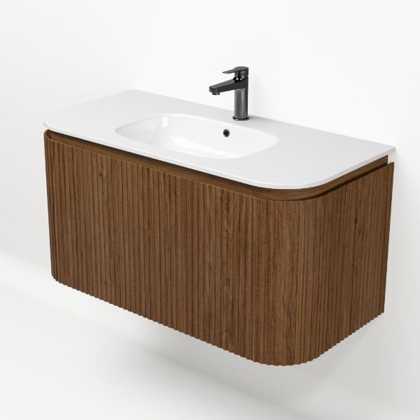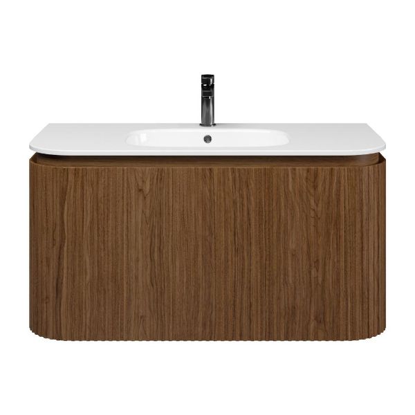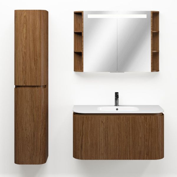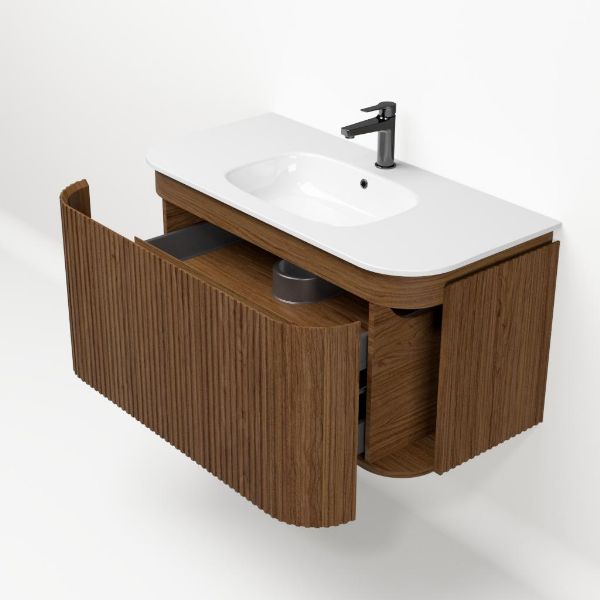 | Bellanti Avelino/Marta badmeubel met ronde hoeken, ribbel - latjes structuur, 100x48 2 softclose laden (1 binnenladen) warm noten greeploos polystone wastafel wit met 1 kraangat |