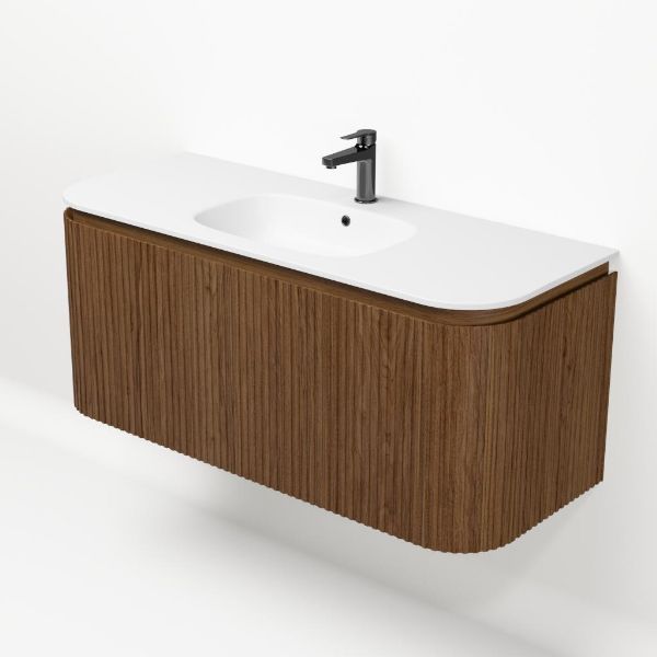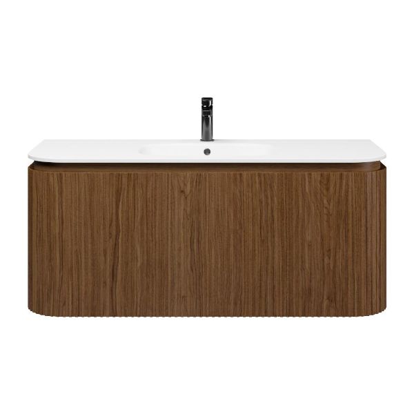 | Bellanti Avelino/Marta badmeubel met ronde hoeken, ribbel - latjes structuur, 120x48 2 softclose lade (1 binnenladen) warm noten greeploos polystone wastafel mat wit met 1 kraangat |