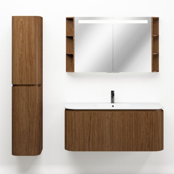 | | Bellanti Avelino/Marta badmeubel met ronde hoeken, ribbel - latjes structuur, 120x48 2 softclose lade (1 binnenladen) warm noten greeploos polystone wastafel mat wit met 1 kraangat |