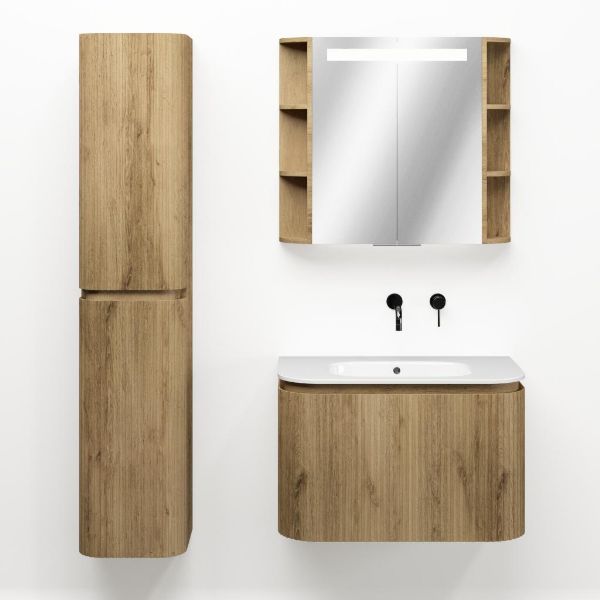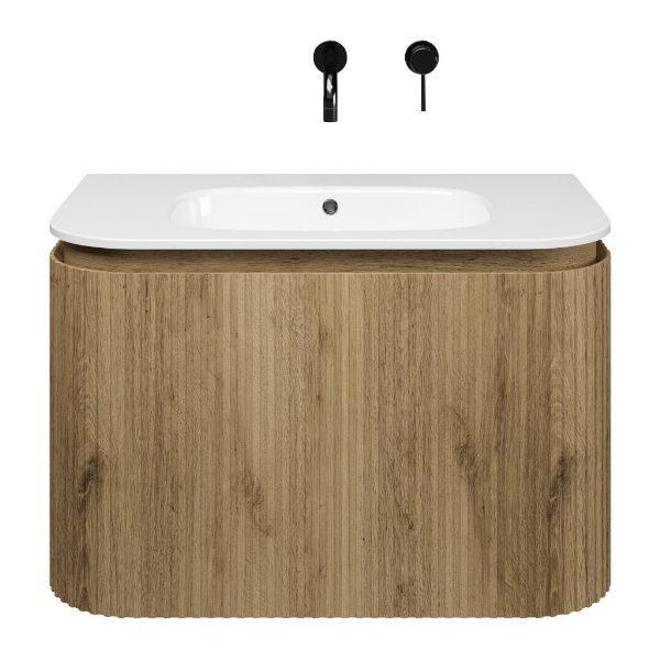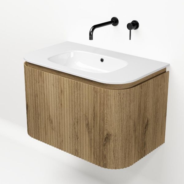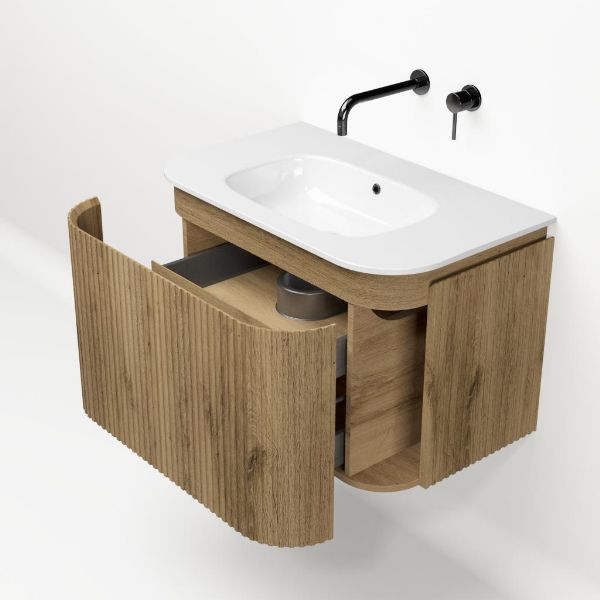| | Bellanti Avelino/Marta badmeubel met ronde hoeken, ribbel - latjes structuur, 80x48 2 softclose laden (1 binnenladen) warm eiken greeploos polystone wastafel wit zonder kraangat |