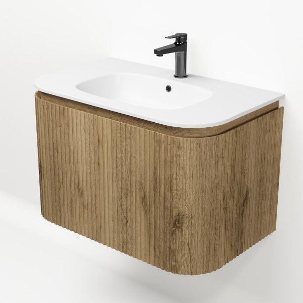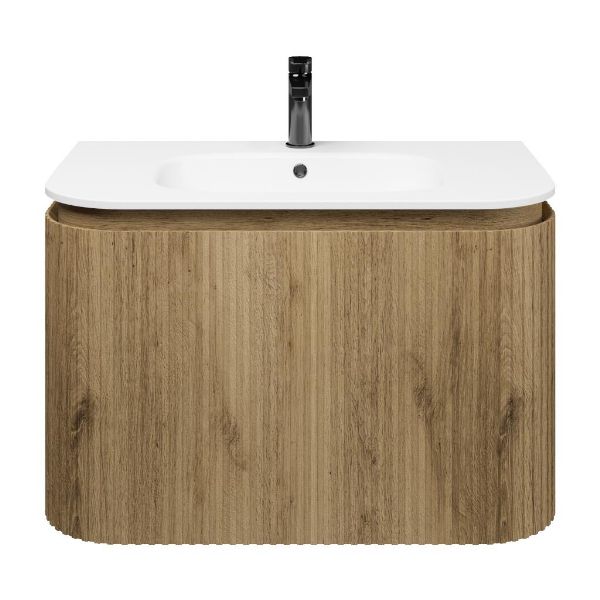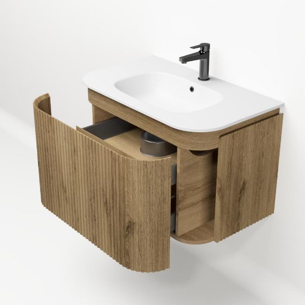 | Bellanti Avelino/Marta badmeubel met ronde hoeken, ribbel - latjes structuur, 80x48 2 softclose laden (1 binnenladen) warm eiken greeploos polystone wastafel mat wit met 1 kraangat |