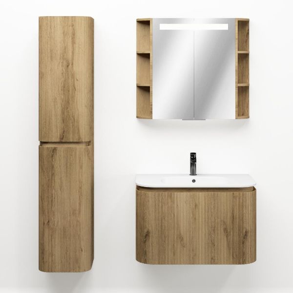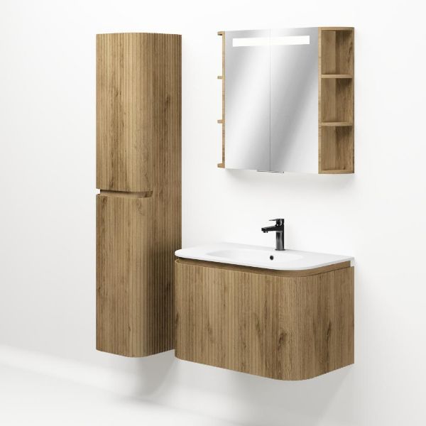 | | Bellanti Avelino/Marta badmeubel met ronde hoeken, ribbel - latjes structuur, 80x48 2 softclose laden (1 binnenladen) warm eiken greeploos polystone wastafel mat wit met 1 kraangat |