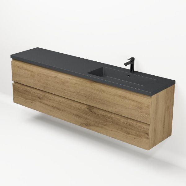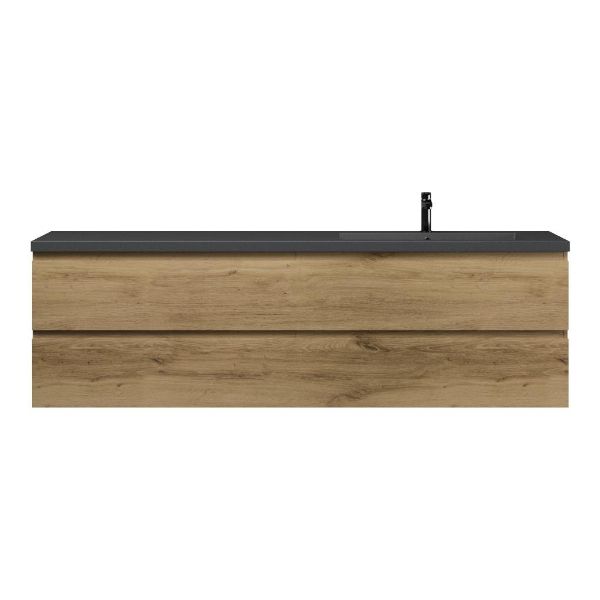 Greeploos badkamermeubel in de kleur eiken warm is 200 cm breed. De wastafel is vervaardig in quartz en heeft de kleur grijs mat quartz. Dit badkamermeubel met deze wastafel is leverbaar tussen de 60 cm t/m 200 cm