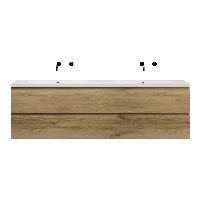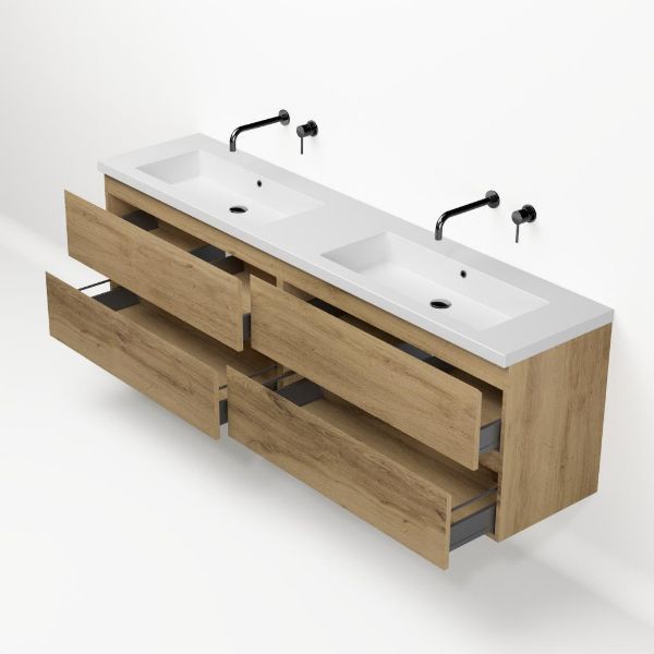 | | Bellanti Gisella/Esta-q badmeubel 200x46 4 softclose laden warm eiken greeploos quartz dubbele wastafel mat wit zonder kraangaten |