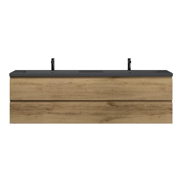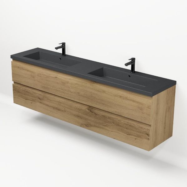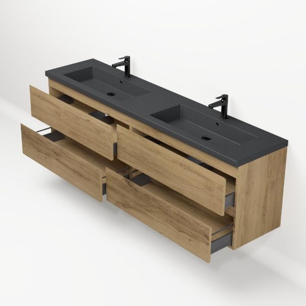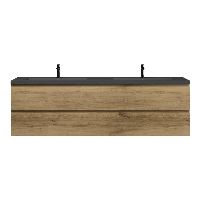 | | Bellanti Gisella/Esta-q badmeubel 200x46 4 softclose laden warm eiken greeploos quartz dubbele wastafel mat grijs met 2 kraangaten |
