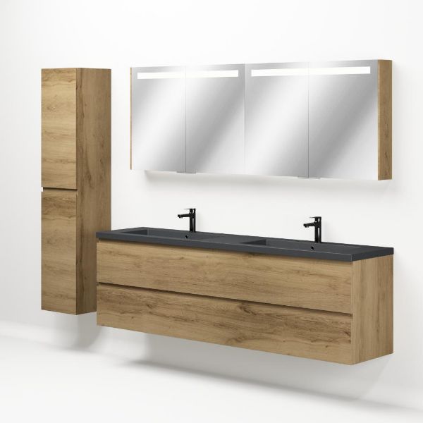 Greeploos badkamermeubel in de kleur eiken warm is 200 cm breed. De wastafel is vervaardig in quartz en heeft de kleur grijs mat quartz. Dit badkamermeubel met deze wastafel is leverbaar tussen de 60 cm t/m 200 cm
