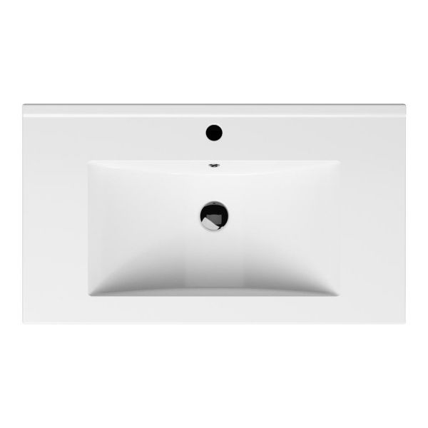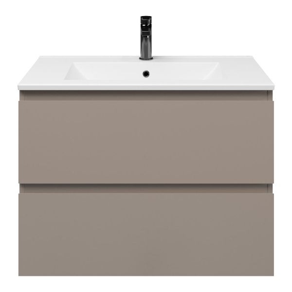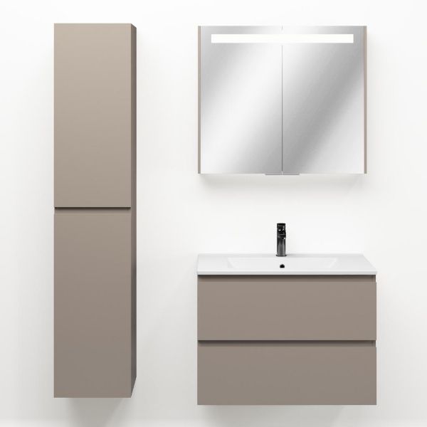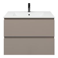 Greeploos badkamermeubel in de kleur taupe is 80 cm breed. De wastafel is vervaardig in keramiek en heeft de kleur wit keramiek. Dit badkamermeubel met deze wastafel is leverbaar tussen de 60 cm t/m 120 cm