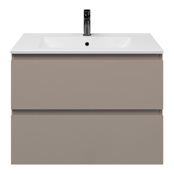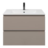 Greeploos badkamermeubel in de kleur taupe is 80 cm breed. De wastafel is vervaardig in keramiek en heeft de kleur wit mat keramiek. Dit badkamermeubel met deze wastafel is leverbaar tussen de 60 cm t/m 120 cm
