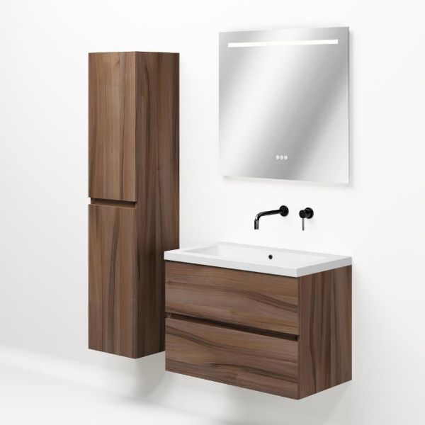 Het Eliza badmeubel bestaat uit een greeploze ladenkast die is uitgevoerd in de kleur robuust noten. Op het meubel ligt een wastafel van polystone met zonder kraangat. Het meubel wordt compleet gemonteerd geleverd en bevat twee ruime laden op Hettich ladegeleiders met softclosing. Achter de laden zit 7 cm vrije ruimte en is daardoor geschikt voor een afvoer zowel naar de muur als de vloer toe. De bovenste lade beschikt tevens over een sifonuitsparing. Het meubel wordt geleverd incl. bevestigingsmateriaal.