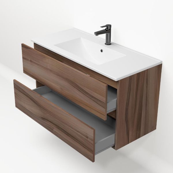 | | TrisLine Eliza/Faro badmeubel 100x46 2 softclose laden robuust noten greeploos keramische wastafel wit met 1 kraangat |
