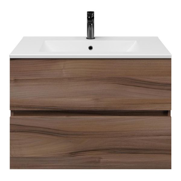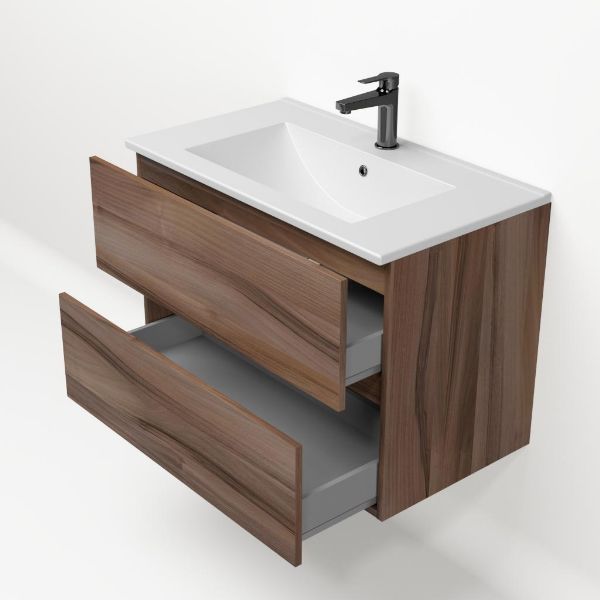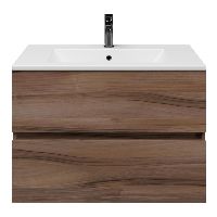 Het Eliza badmeubel bestaat uit een greeploze ladenkast die is uitgevoerd in de kleur robuust noten. Op het meubel ligt een wastafel van keramiek met 1 kraangat. Het meubel wordt compleet gemonteerd geleverd en bevat twee ruime laden op Hettich ladegeleiders met softclosing. Achter de laden zit 7 cm vrije ruimte en is daardoor geschikt voor een afvoer zowel naar de muur als de vloer toe. De bovenste lade beschikt tevens over een sifonuitsparing. Het meubel wordt geleverd incl. bevestigingsmateriaal.