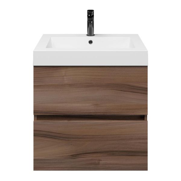 - greeploos badmeubel - meubelkleur robuust noten - wastafel van polystone - Hettich softclose ladegeleiders