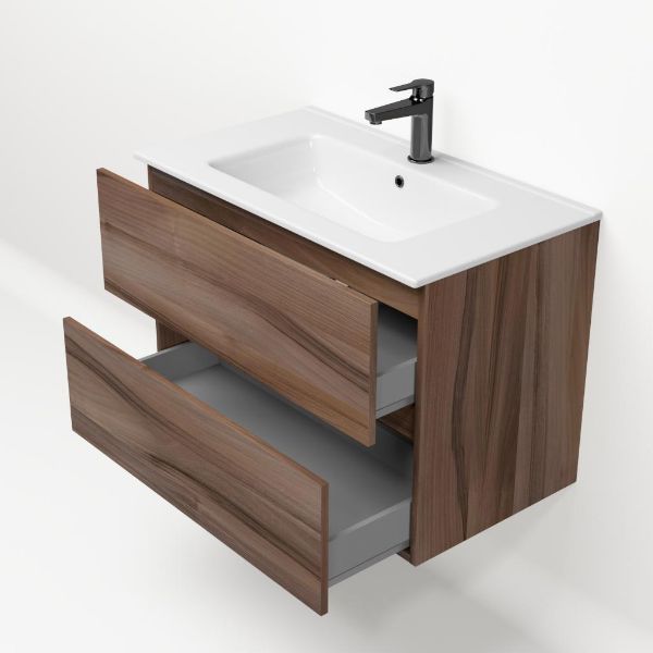 Het Eliza badmeubel bestaat uit een greeploze ladenkast die is uitgevoerd in de kleur robuust noten. Op het meubel ligt een wastafel van keramiek met 1 kraangat. Het meubel wordt compleet gemonteerd geleverd en bevat twee ruime laden op Hettich ladegeleiders met softclosing. Achter de laden zit 7 cm vrije ruimte en is daardoor geschikt voor een afvoer zowel naar de muur als de vloer toe. De bovenste lade beschikt tevens over een sifonuitsparing. Het meubel wordt geleverd incl. bevestigingsmateriaal.