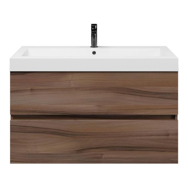 - greeploos badmeubel - meubelkleur robuust noten - wastafel van polystone - Hettich softclose ladegeleiders