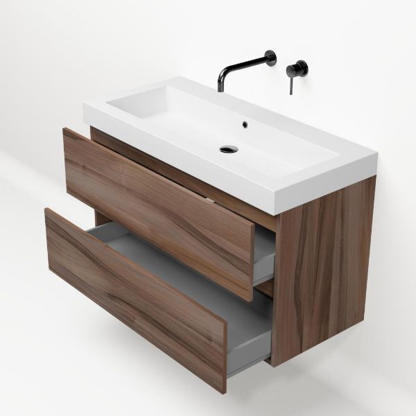- greeploos badmeubel - meubelkleur robuust noten - wastafel van polystone - Hettich softclose ladegeleiders