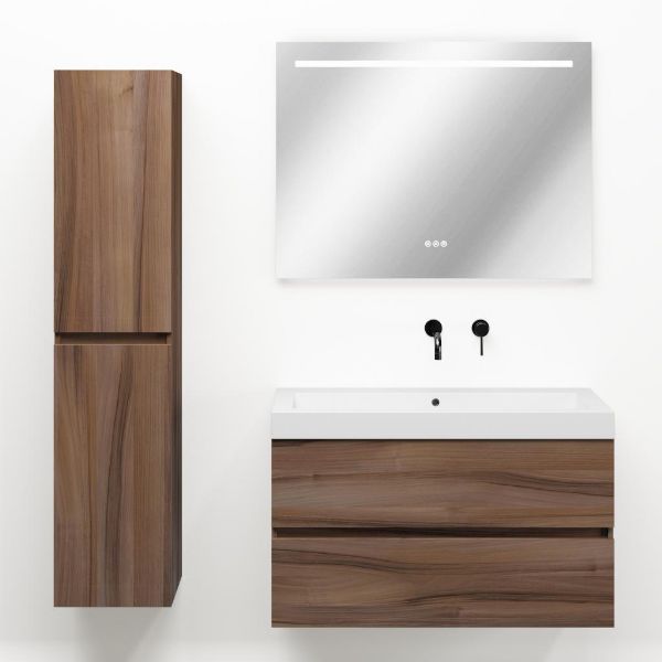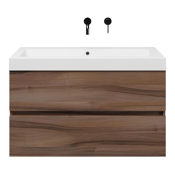Het Eliza badmeubel bestaat uit een greeploze ladenkast die is uitgevoerd in de kleur robuust noten. Op het meubel ligt een wastafel van polystone met zonder kraangat. Het meubel wordt compleet gemonteerd geleverd en bevat twee ruime laden op Hettich ladegeleiders met softclosing. Achter de laden zit 7 cm vrije ruimte en is daardoor geschikt voor een afvoer zowel naar de muur als de vloer toe. De bovenste lade beschikt tevens over een sifonuitsparing. Het meubel wordt geleverd incl. bevestigingsmateriaal.