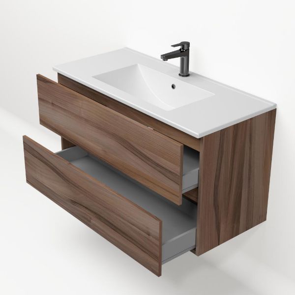 | | TrisLine Eliza/Faro badmeubel 100x46 2 softclose laden robuust noten greeploos keramische wastafel mat wit met 1 kraangat |