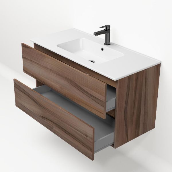| | TrisLine Eliza/Quadra badmeubel 100x46 2 softclose laden robuust noten greeploos keramische wastafel wit met 1 kraangat |