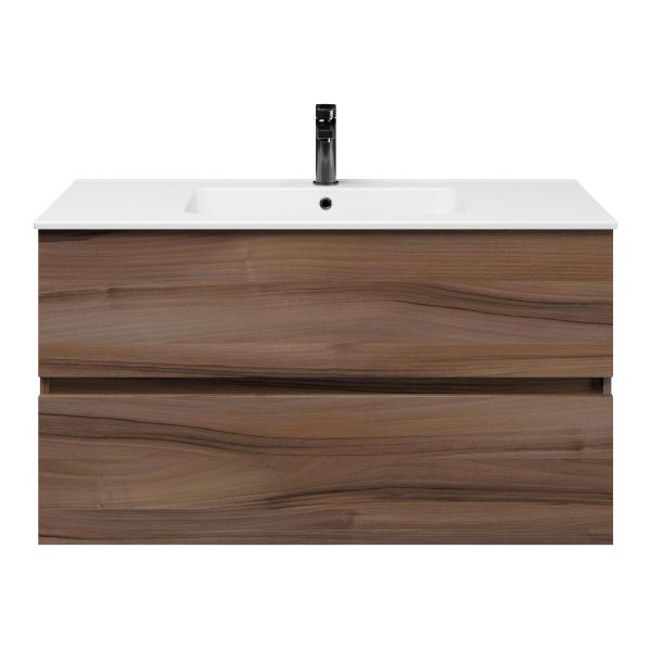 | TrisLine Eliza/Quadra badmeubel 100x46 2 softclose laden robuust noten greeploos keramische wastafel wit met 1 kraangat |