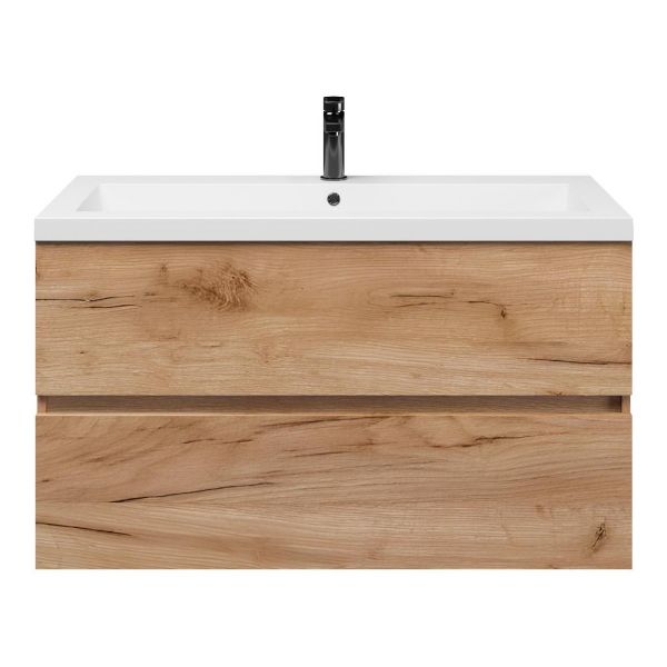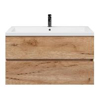 Het Eliza badmeubel bestaat uit een greeploze ladenkast die is uitgevoerd in de kleur robuust eiken. Op het meubel ligt een wastafel van polystone met 1 kraangat. Het meubel wordt compleet gemonteerd geleverd en bevat twee ruime laden op Hettich ladegeleiders met softclosing. Achter de laden zit 7 cm vrije ruimte en is daardoor geschikt voor een afvoer zowel naar de muur als de vloer toe. De bovenste lade beschikt tevens over een sifonuitsparing. Het meubel wordt  geleverd incl. bevestigingsmateriaal.