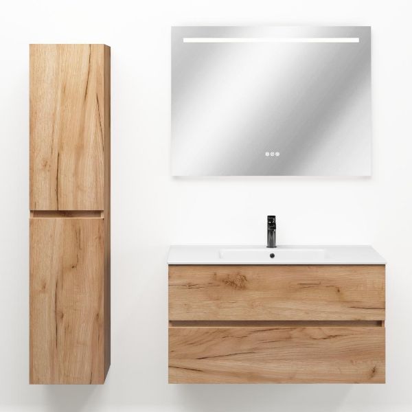 Het Eliza badmeubel bestaat uit een greeploze ladenkast die is uitgevoerd in de kleur robuust eiken. Op het meubel ligt een wastafel van keramiek met 1 kraangat. Het meubel wordt compleet gemonteerd geleverd en bevat twee ruime laden op Hettich ladegeleiders met softclosing. Achter de laden zit 7 cm vrije ruimte en is daardoor geschikt voor een afvoer zowel naar de muur als de vloer toe. De bovenste lade beschikt tevens over een sifonuitsparing. Het meubel wordt geleverd incl. bevestigingsmateriaal.