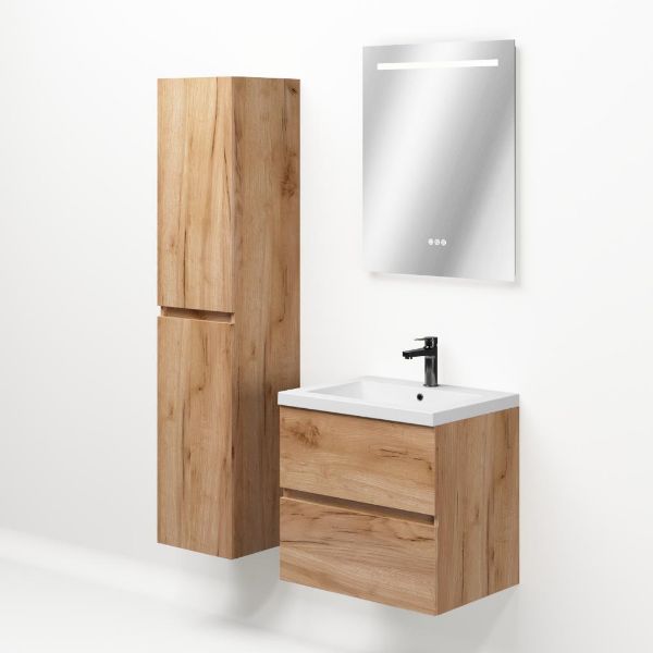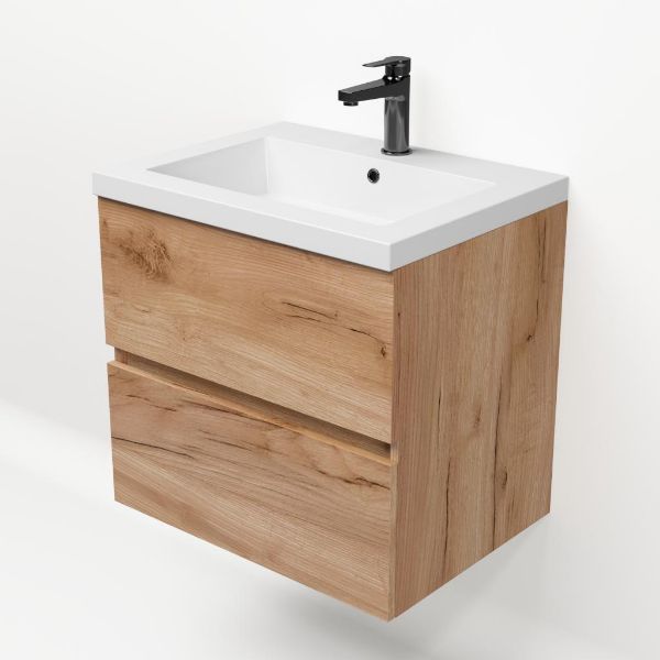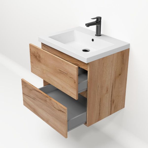 | TrisLine Eliza/Esta badmeubel 60x46 2 softclose laden robuust eiken greeploos polystone wastafel wit met 1 kraangat |