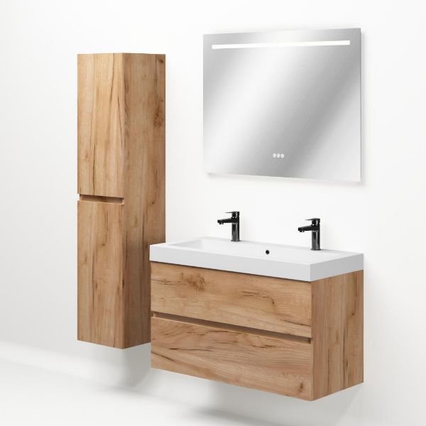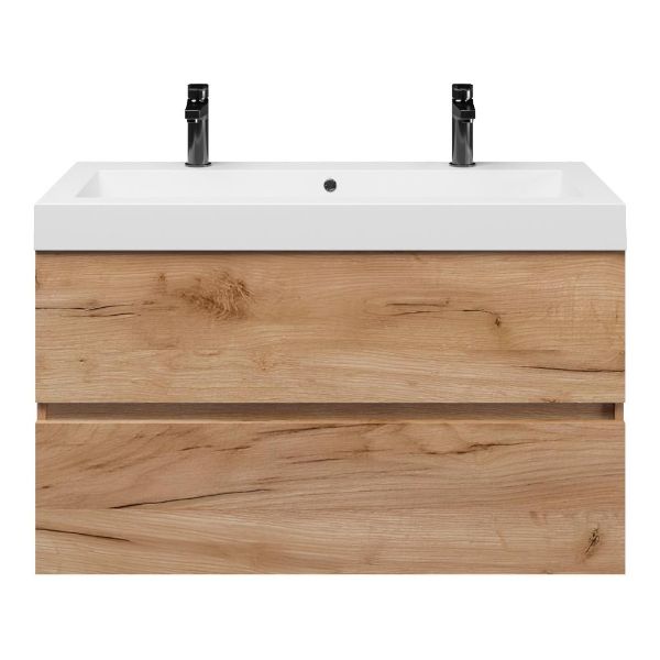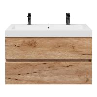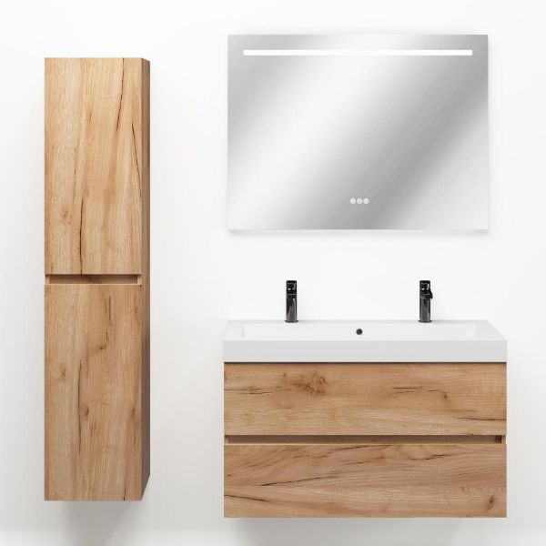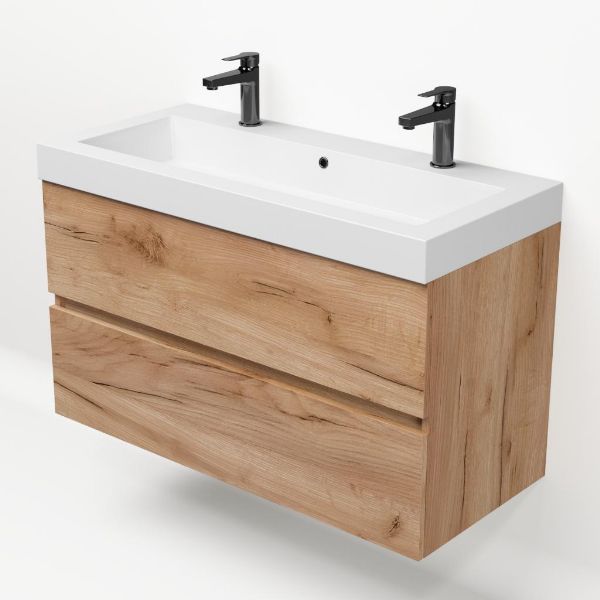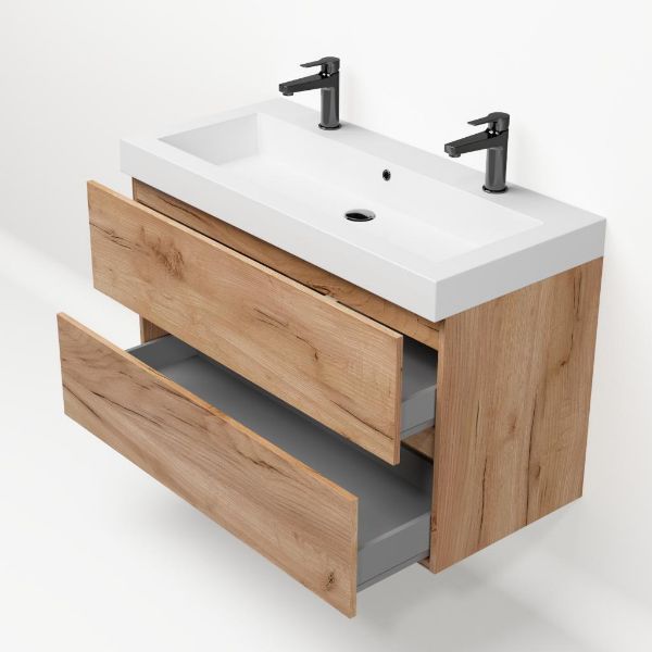 TrisLine Eliza/Esta badmeubel 100x46 2 softclose laden robuust eiken greeploos polystone wastafel wit met 2 kraangaten
