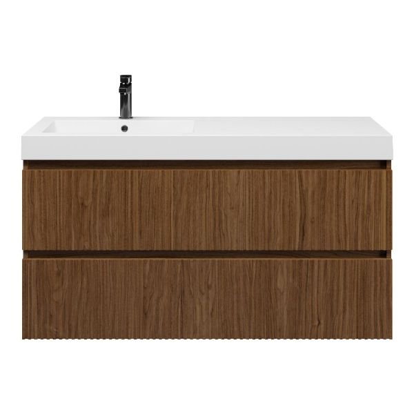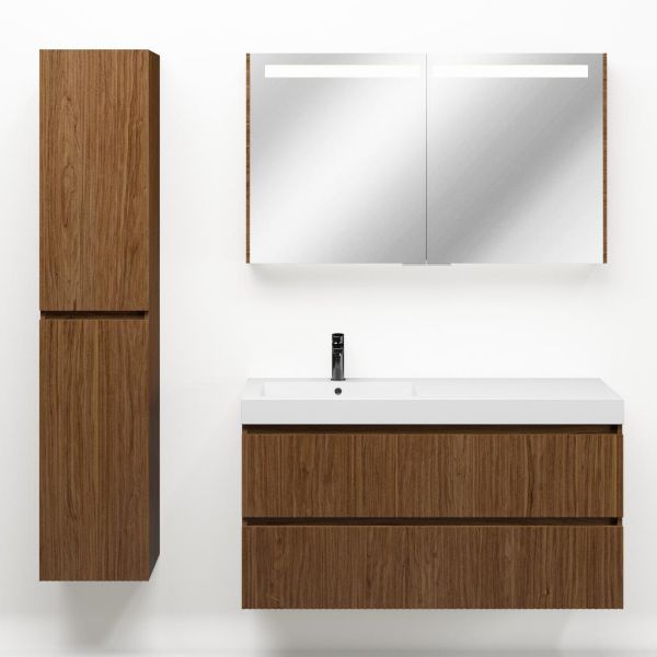 Bellanti Silvan/Esta badmeubel 120x46 2 softclose laden met ribbel - latjes structuur warm noten greeploos polystone wastafel wit met 1 kraangat
