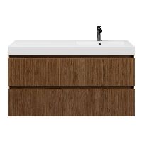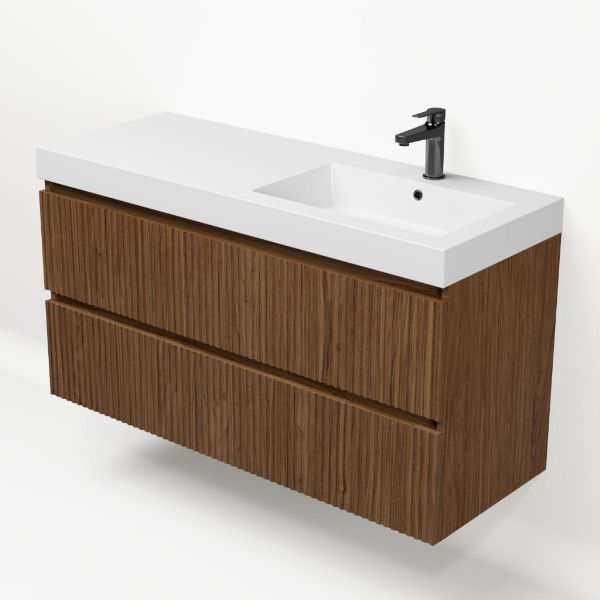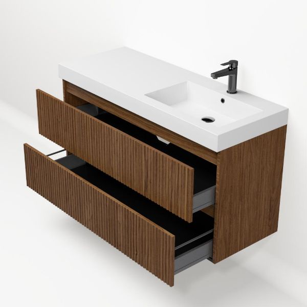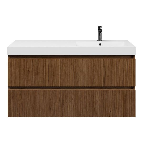 Bellanti Silvan/Esta badmeubel 120x46 2 softclose laden met ribbel - latjes structuur warm noten greeploos polystone wastafel wit met 1 kraangat