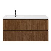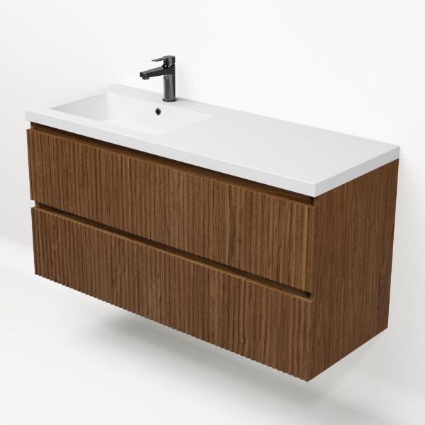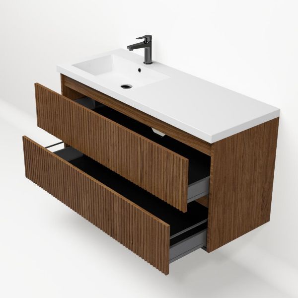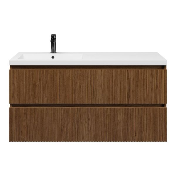 Bellanti Silvan/Esta badmeubel 120x46 2 softclose laden met ribbel - latjes structuur warm noten greeploos polystone wastafel wit met 1 kraangat