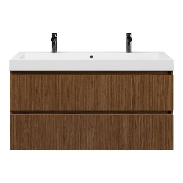 | Bellanti Silvan/Esta badmeubel 120x46 2 softclose laden met ribbel - latjes structuur warm noten greeploos polystone wastafel wit met 2 kraangaten |