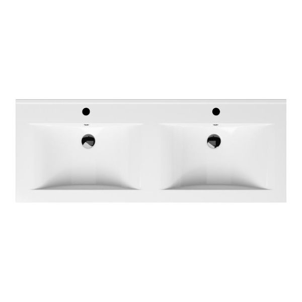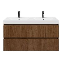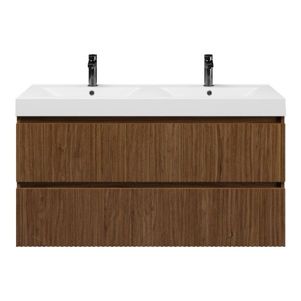 | | Bellanti Silvan/Wave badmeubel 120x46 2 softclose laden met ribbel - latjes structuur warm noten greeploos polystone wastafel dubbel wit met 2 kraangaten |