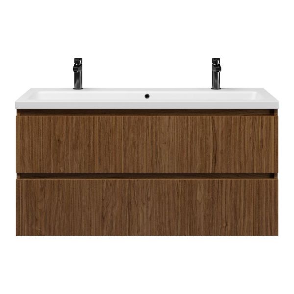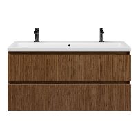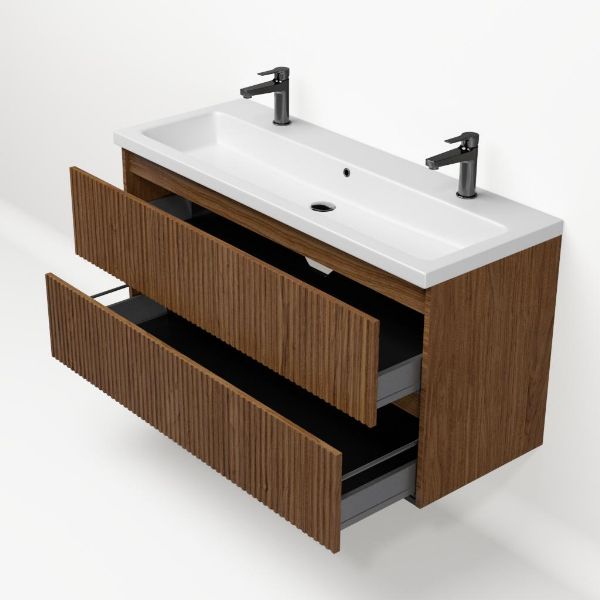 | Bellanti Silvan/Amelia badmeubel 120x46 2 softclose laden met ribbel - latjes structuur warm noten greeploos keramische wastafel wit mat met 2 kraangaten |