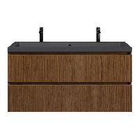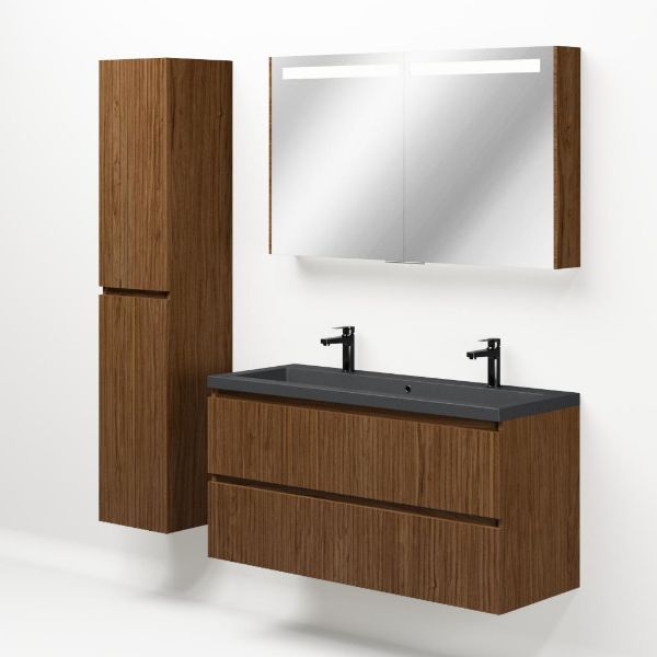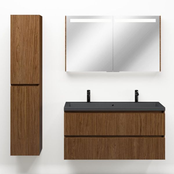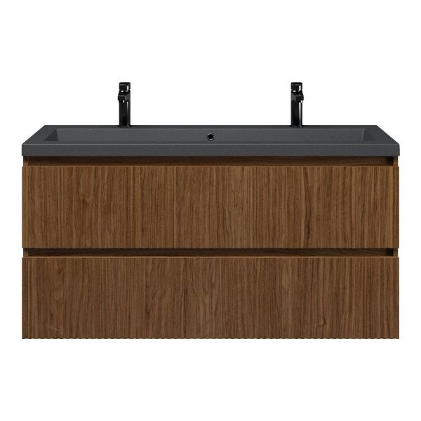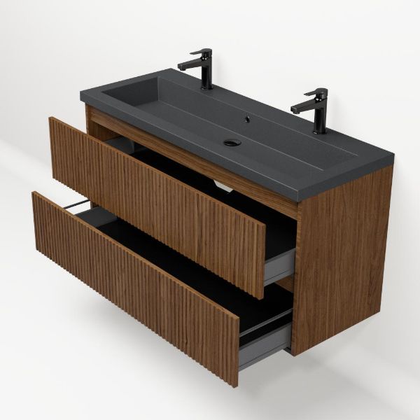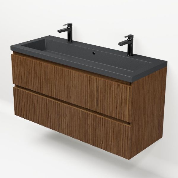 Bellanti Silvan/Esta-Q badmeubel 120x46 2 softclose laden met ribbel - latjes structuur warm noten greeploos quartz wastafel mat grijs met 2 kraangaten