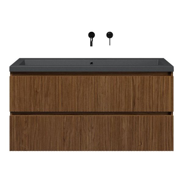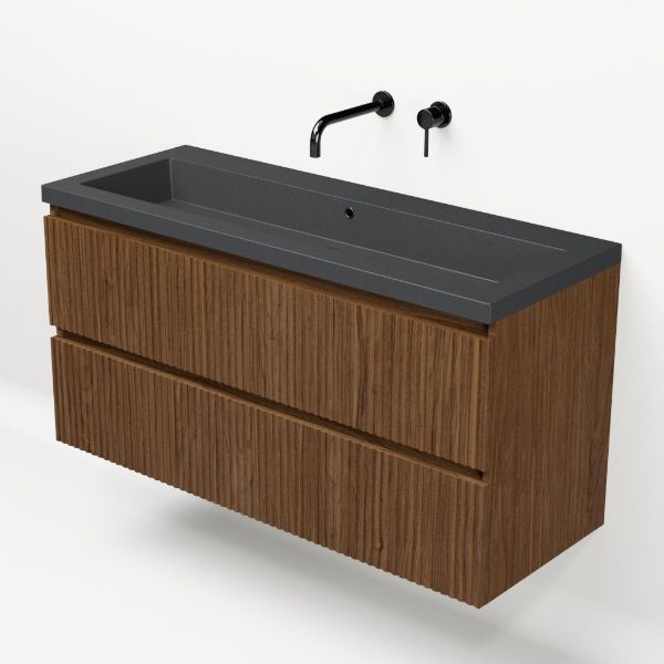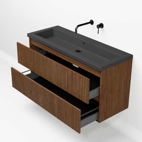 Bellanti Silvan/Esta-Q badmeubel 120x46 2 softclose laden met ribbel - latjes structuur warm noten greeploos quartz wastafel mat grijs zonder kraangaten