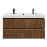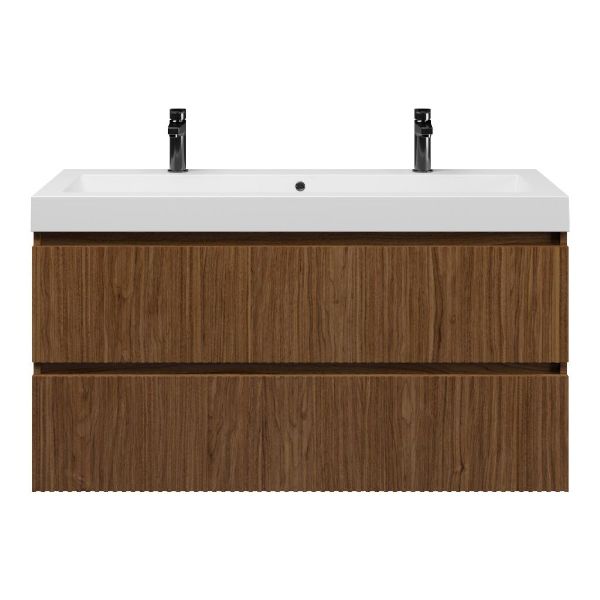 | Bellanti Silvan/Esta-Q badmeubel 120x46 2 softclose laden met ribbel - latjes structuur warm noten greeploos quartz wastafel mat witmet 2 kraangaten |