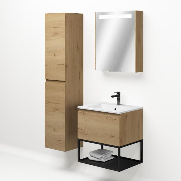 | Bellanti Solo/Tela/Faro badmeubel 60x46 1 softclose lade eiken natuur greeploos keramische wastafel wit met 1 kraangat met mat zwart metalen frame |