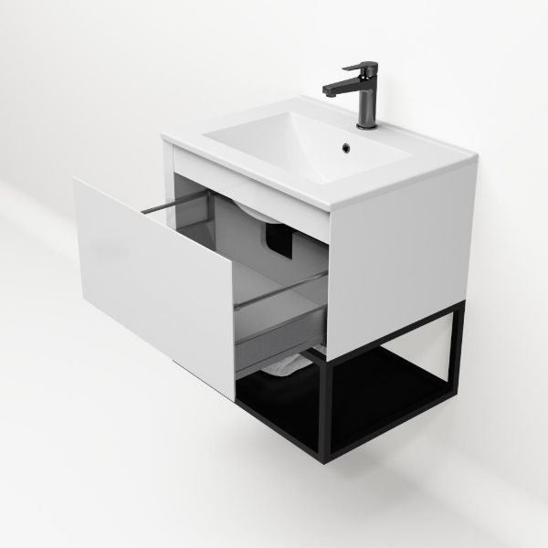 | Bellanti Solo/Tela/Faro badmeubel 60x46 1 softclose lade wit hoogglans greeploos keramische wastafel wit met 1 kraangat met mat zwart metalen frame |