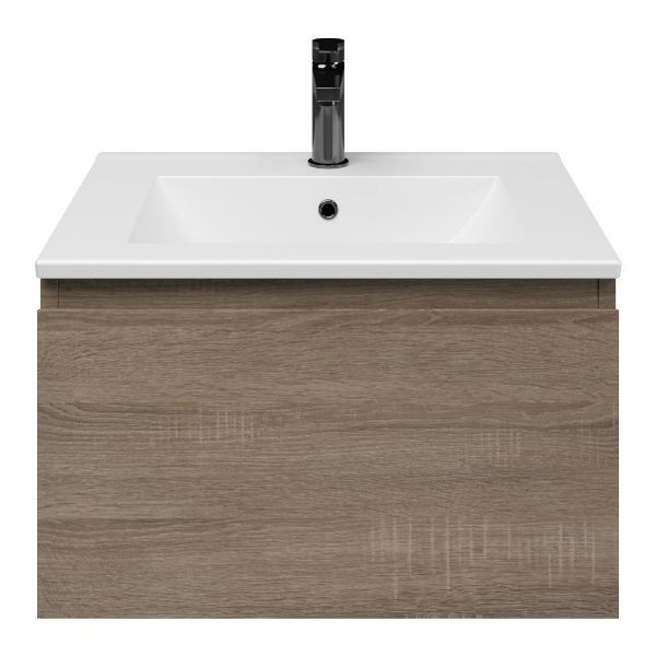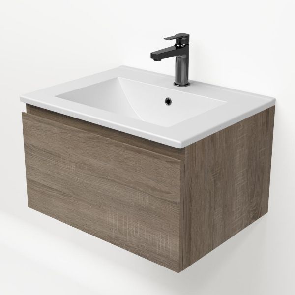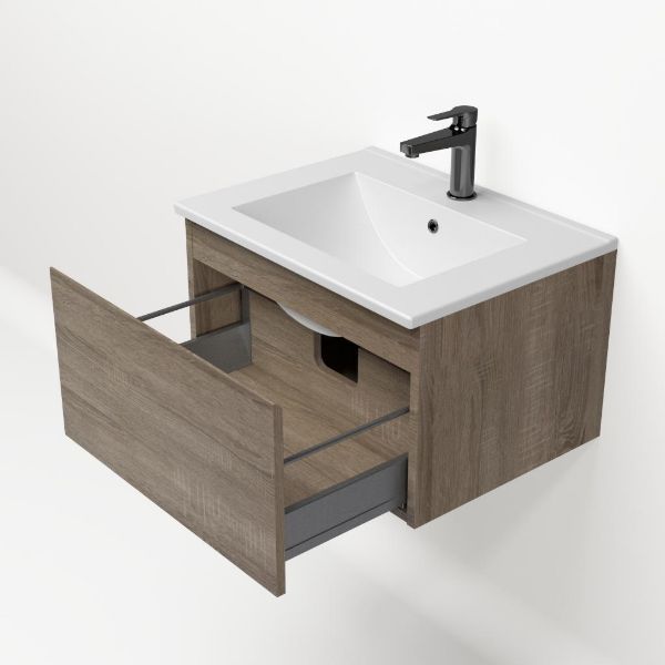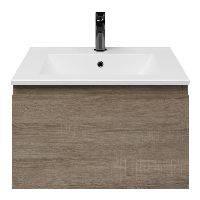Greeploos badkamermeubel in de kleur eiken donker is 60 cm breed. De wastafel is vervaardig in keramiek en heeft de kleur wit mat keramiek. Dit badkamermeubel met deze wastafel is leverbaar tussen de 60 cm t/m 120 cm