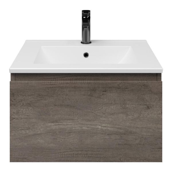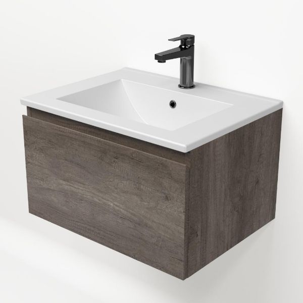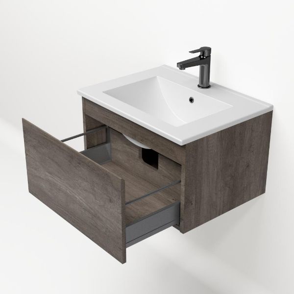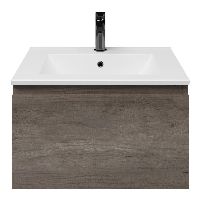 Greeploos badkamermeubel in de kleur olm donker grijs is 60 cm breed. De wastafel is vervaardig in keramiek en heeft de kleur wit mat keramiek. Dit badkamermeubel met deze wastafel is leverbaar tussen de 60 cm t/m 120 cm