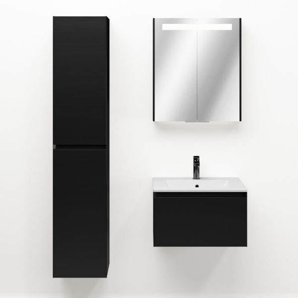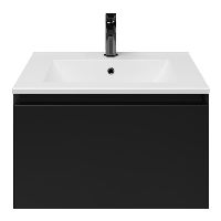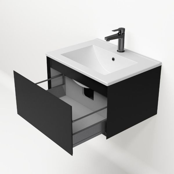 Greeploos badkamermeubel in de kleur zwart mat is 60 cm breed. De wastafel is vervaardig in keramiek en heeft de kleur wit mat keramiek. Dit badkamermeubel met deze wastafel is leverbaar tussen de 60 cm t/m 120 cm