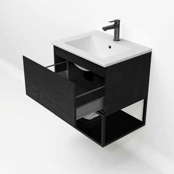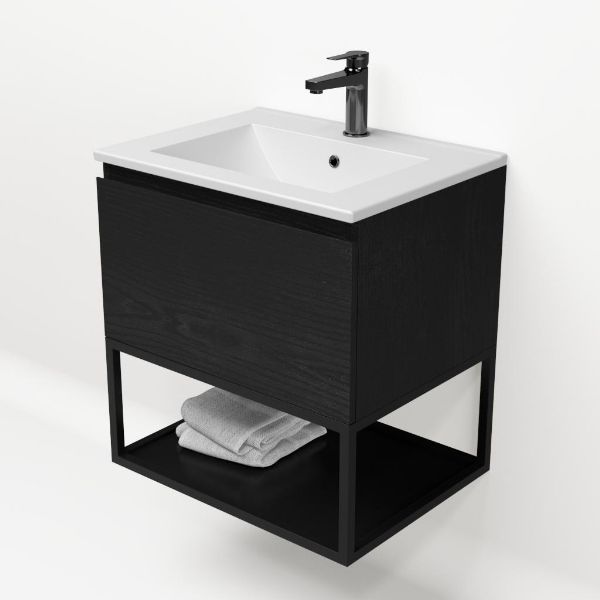 | | Bellanti Solo/Tela/Faro badmeubel 60x46 1 softclose lade mat zwart eiken greeploos keramische wastafel mat wit met 1 kraangat met mat zwart metalen frame |