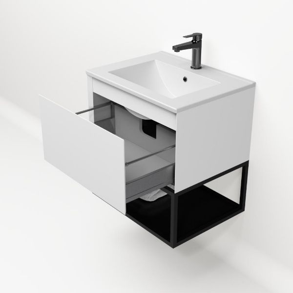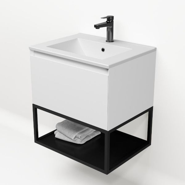 | | Bellanti Solo/Tela/Faro badmeubel 60x46 1 softclose lade wit mat greeploos keramische wastafel mat wit met 1 kraangat met mat zwart metalen frame |
